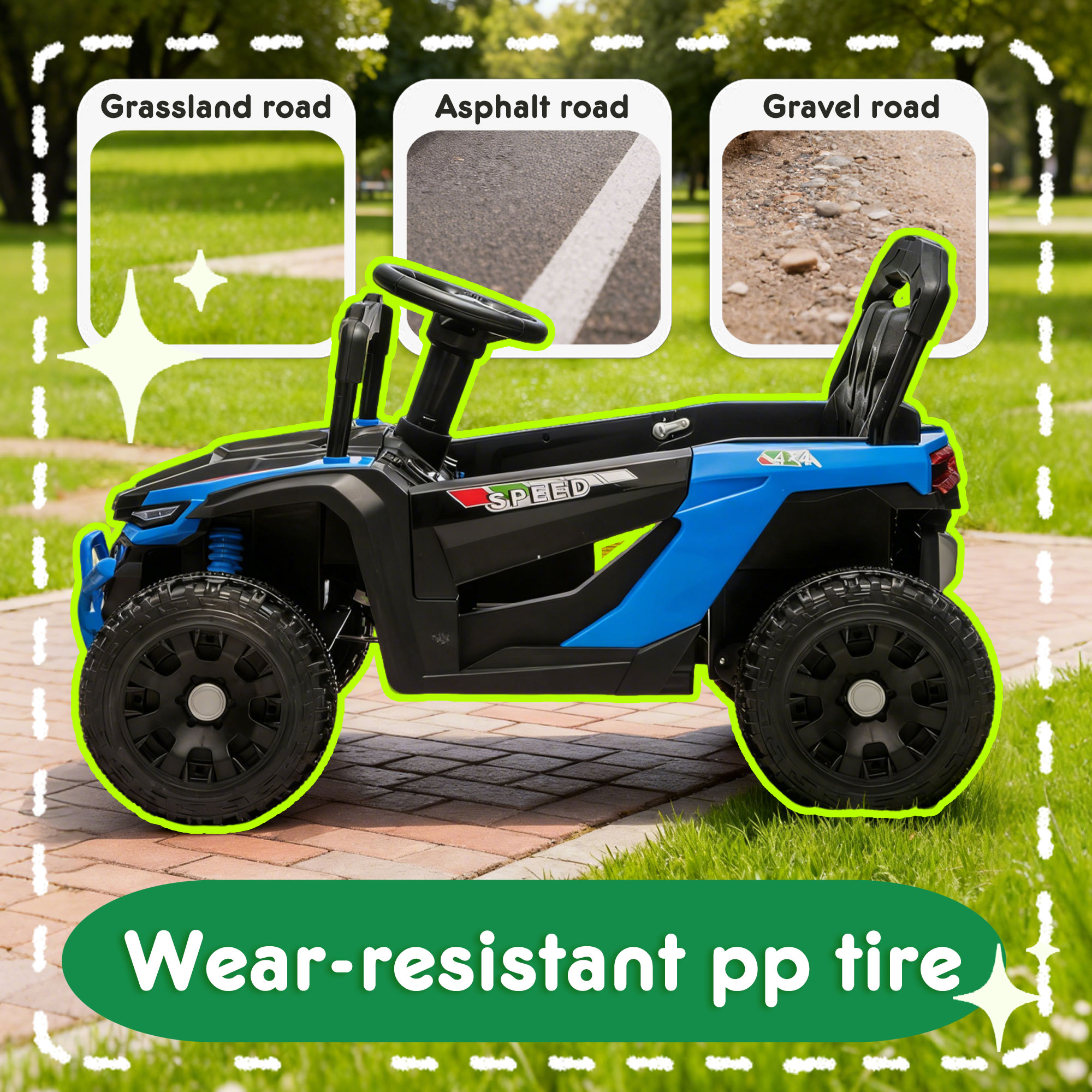 - Four-wheel suspension:This drivable toy car for kids features a reliable four-wheel suspension system. Each wheel has independent shock absorption, effectively cushioning the bumps of uneven roads. This keeps the vehicle stable, preventing sudden tilts that could cause children to feel unsteady. It also reduces vibration transmitted to the seat, keeping little drivers comfortable even during intense play.