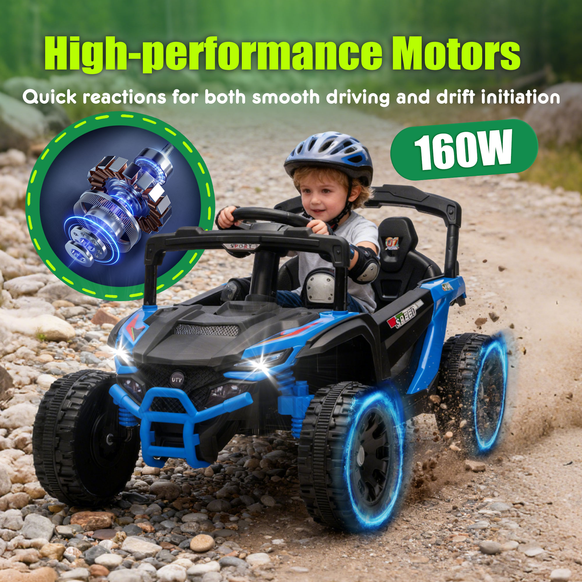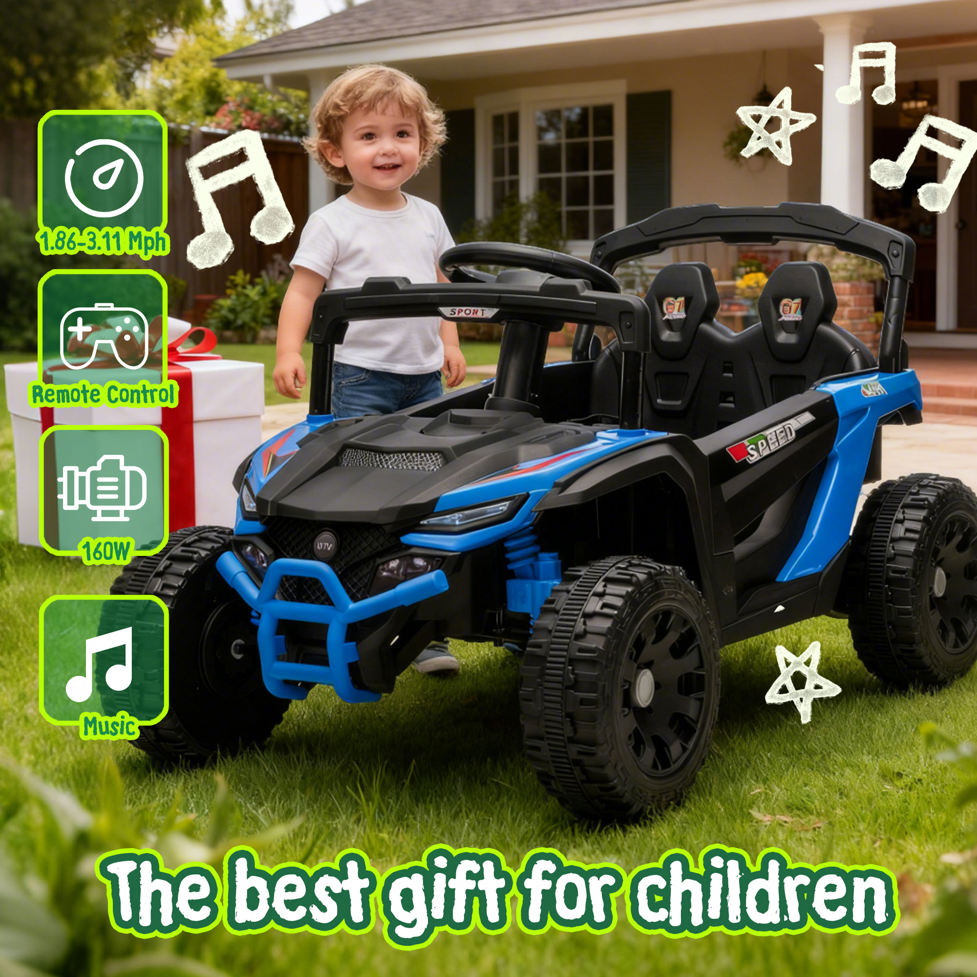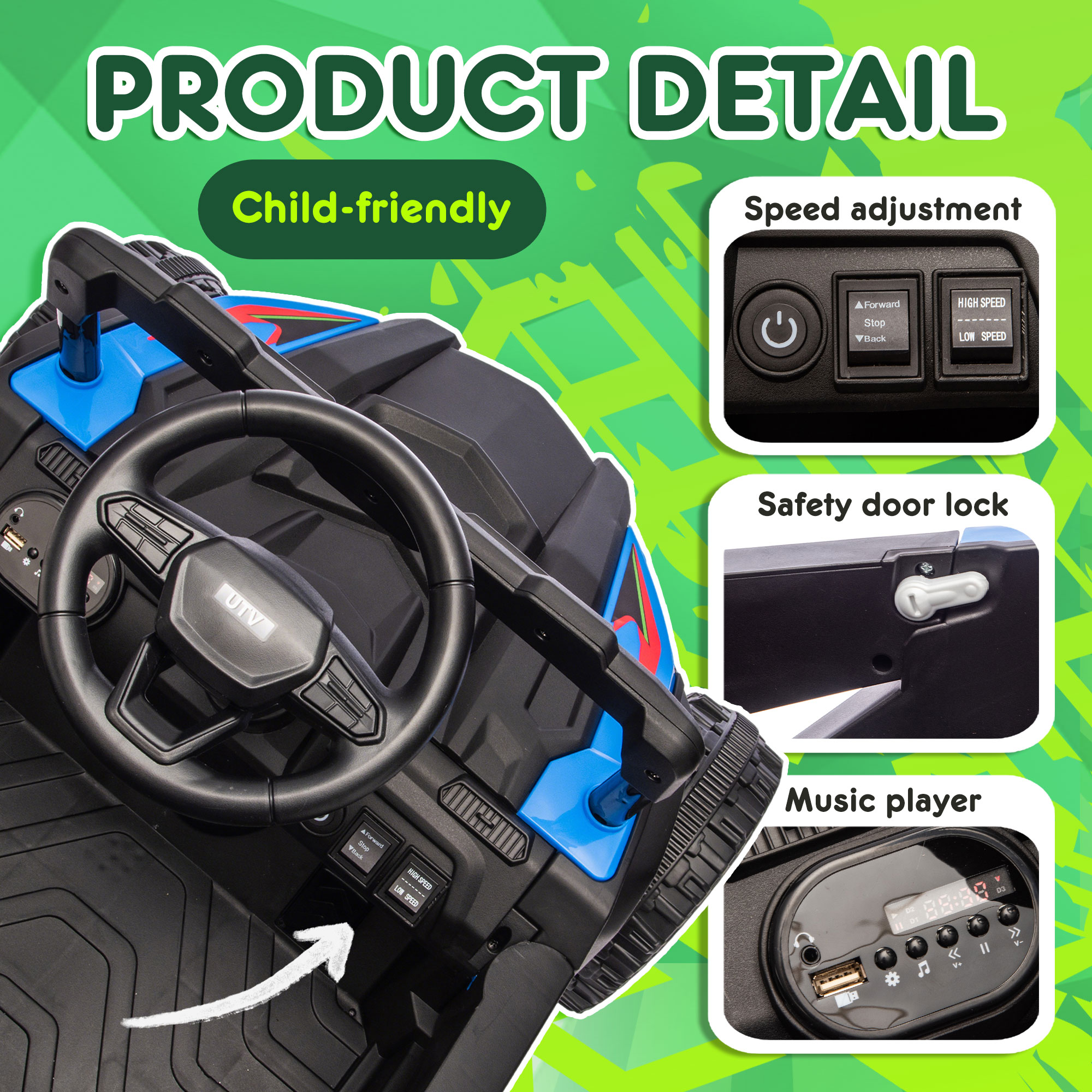 - Bluetooth& MP3 Music Playback:Bluetooth and MP3 music playback function can bring more joy to children’s driving. Parents can connect their mobile phones to the toy car via Bluetooth and play children’s favorite nursery rhymes, cartoon theme songs or interesting stories. When kids drive the car while listening to familiar music, their driving fun will be greatly enhanced. This function not only enriches the playing experience but also allows children to enjoy the pleasure of music while driving.