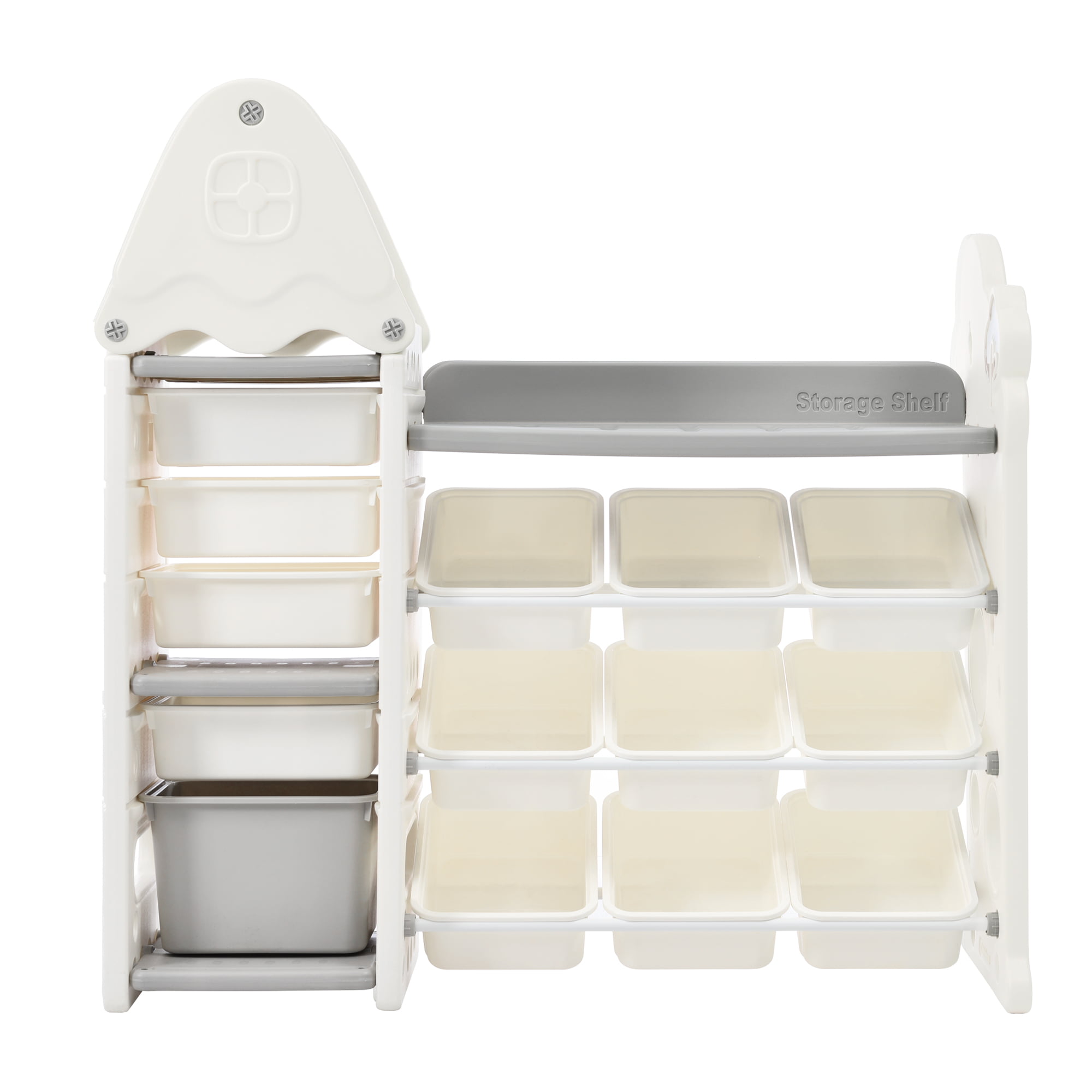 - HUGE AND RELIABLE – This high-capacity nursery organizer set has 13 medium bins, 4 large bins(removable), and 4 line bookshelves, plus a wide storage shelf on the top and a raised hanging rack on the side, providing a considerable amount of storage space.